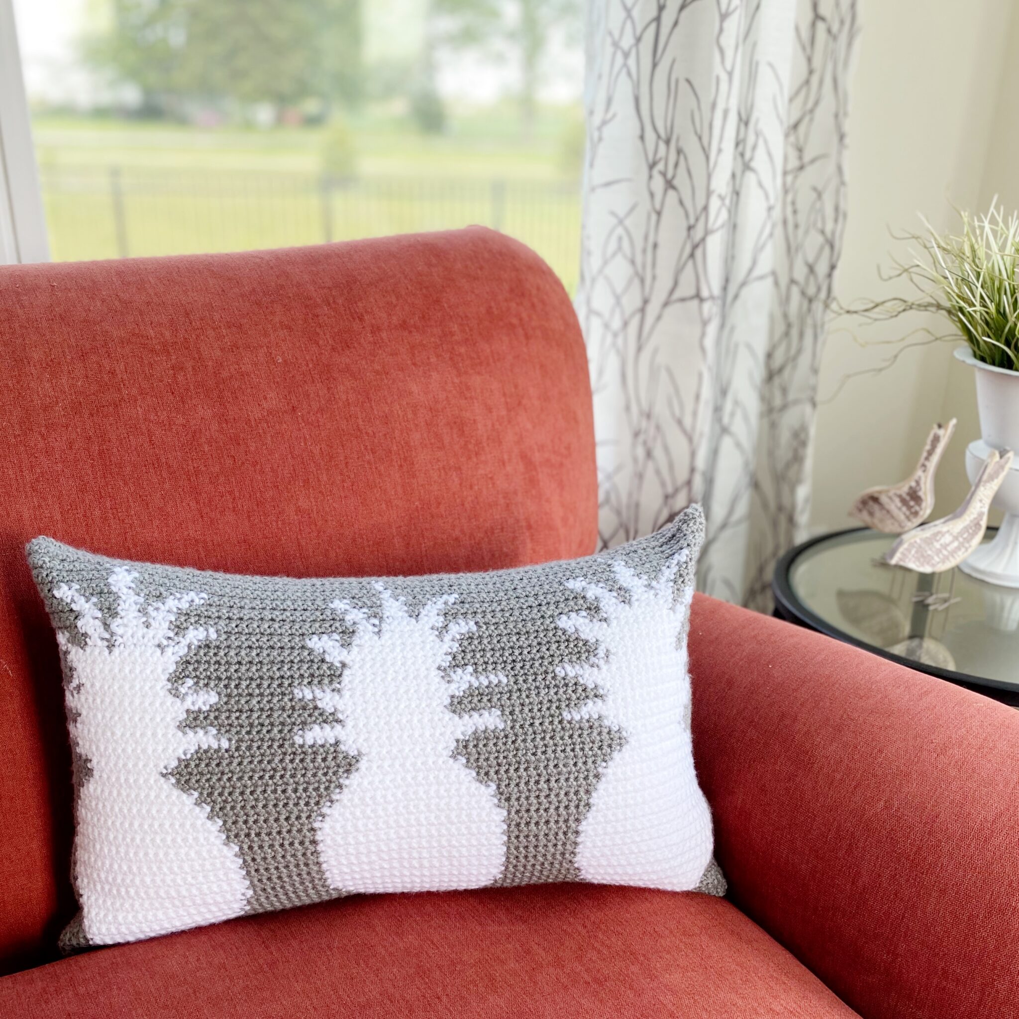 Make a crochet holiday pillow with unique texture that represents a snowy forest perfect for your Christmas decor.