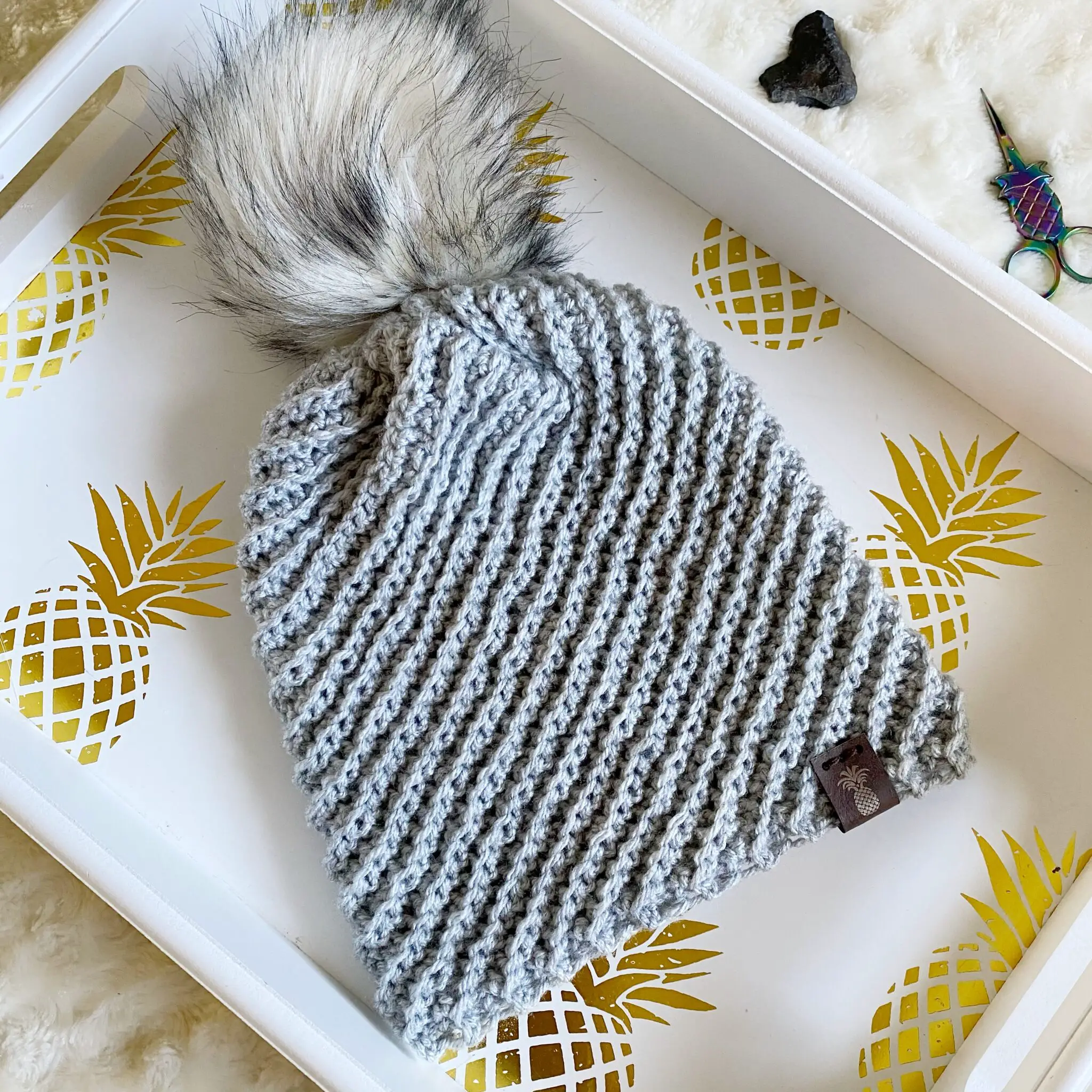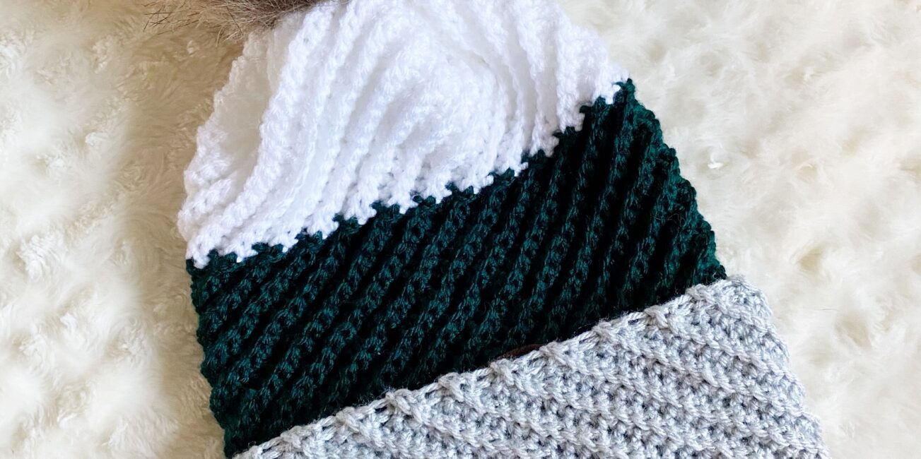 Crochet a beanie that features diagonal ribbing texture with this free crochet beanie pattern that includes modifications for brimmed, brimless, solid-color, or color-blocked.